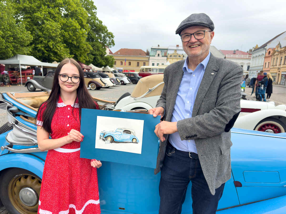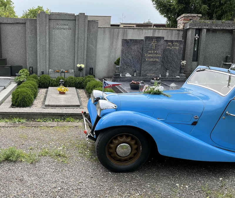 Aero 30 Kabriolett am Grab von Josef Sodomka im Juji 2025 Im Zusammenhang mit 130 Jahre Firmengeschichte Sodomka und dem 30. Treffen der Sodomka-Freunde wurde Michael Strauch die Ehre zuteil, mit seinem Aero 30 Kabriolett von 1937 das Familiengrab im Friedhof von Vysoke Myto zu besuchen.
