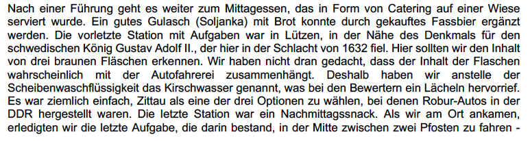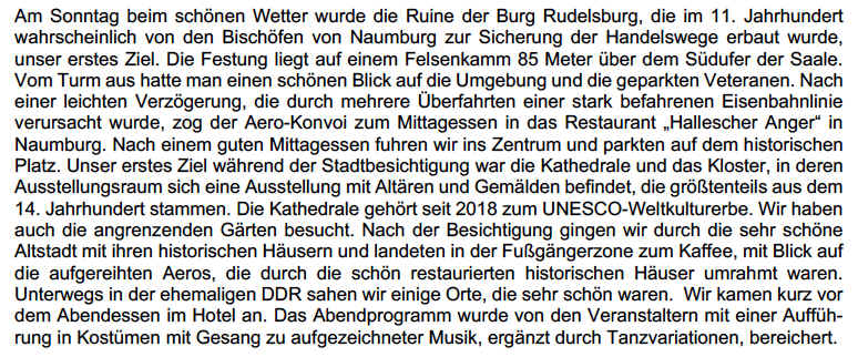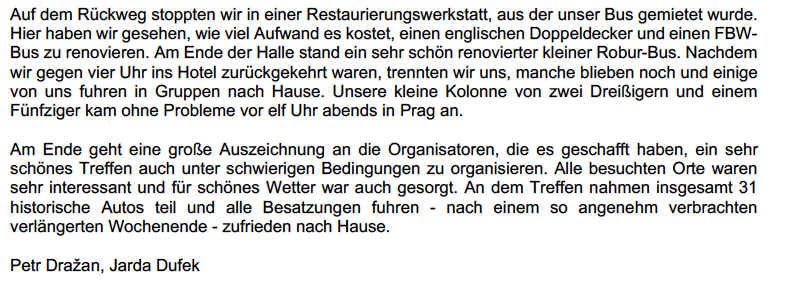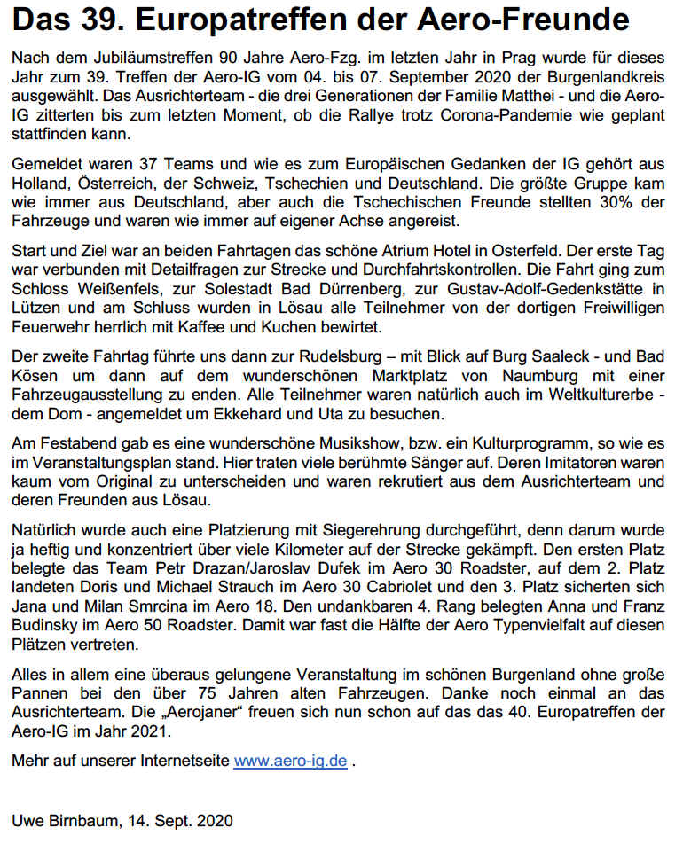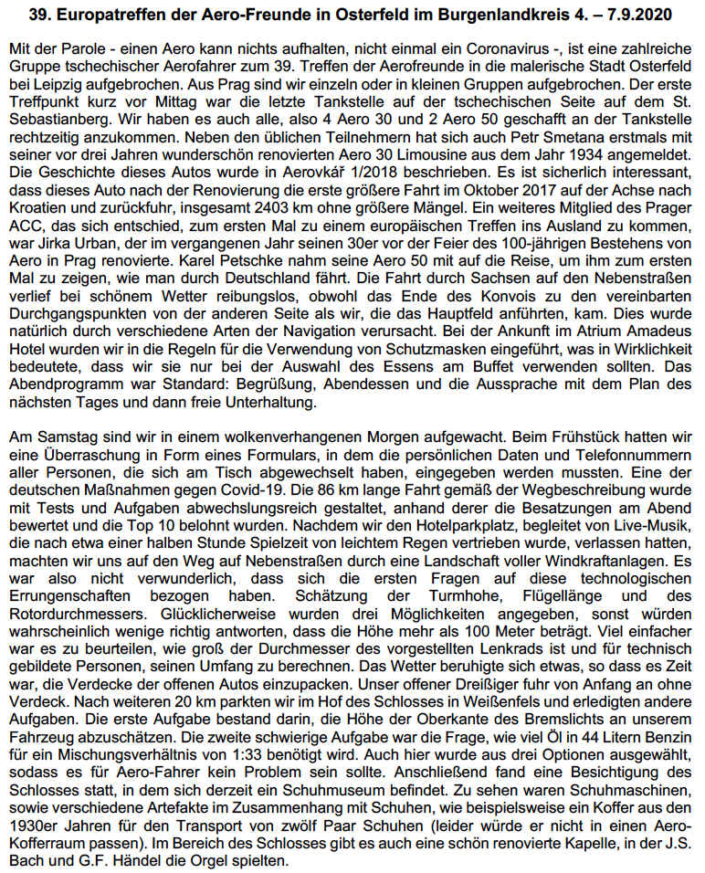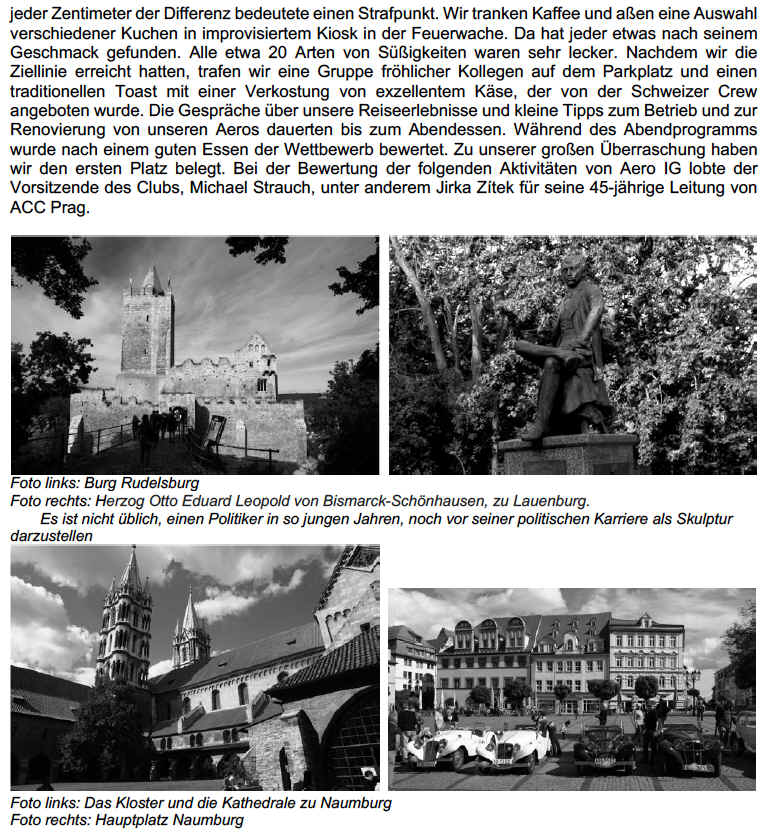 Die Teilnehmer mit dem weinroten Aero 30 Sport aus der Tschechischen Republik (siehe Foto oberhalb dieses Textes), die an der Ausfahrt am Samstag den 1. Preis erhalten haben, waren das Team Petr Drazan/Jaruslov Dufek. Ihr Bericht steht hier: